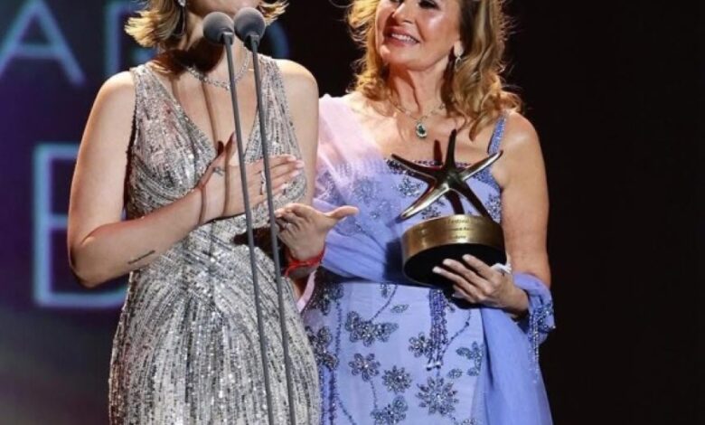 وفي لفتة إنسانية مؤثرة، قدمت الفنانة المصرية يسرا الجائزة لمنة شلبي على خشبة المسرح، في تكريم جاء تقديرًا لمسيرتها الفنية الحافلة بالأدوار المتميزة والإسهامات المؤثرة في السينما المصرية والعربية.
