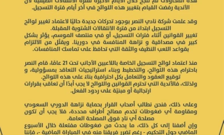 البيان كشف قلق النصر من التحركات الخاصة بتعديل أنظمة تسجيل اللاعبين الأجانب تحت 21 عاماً أثناء الموسم، معتبراً أن ذلك يمسّ استقرار القوانين ويؤثر على نزاهة المنافسة ومصداقية الدوري.
