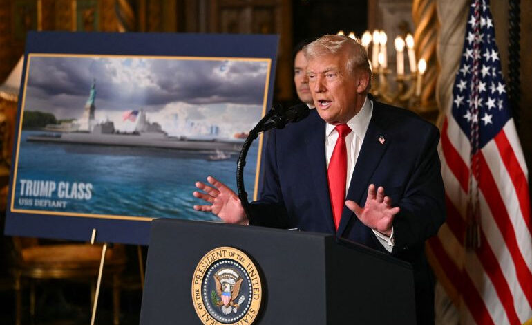وقال ترامب في مؤتمر صحفي من مقر إقامته في ولاية فلوريدا، أمس الإثنين، إنه وافق على خطة لبناء سفينتين حربيتين “جديدتين كلياً، أقوى وأكبر وأسرع 100 مرة من أي بارجة حربية سابقة”، موضحاً أن تلك السفينة ستكون “أكبر سفينة بنيت في التاريخ على الإطلاق”، كاشفاً، بحسب موقع الجزيرة نت، عن العمل على تصنيع 15 غواصة في الوقت الحالي و3 حاملات طائرات.
