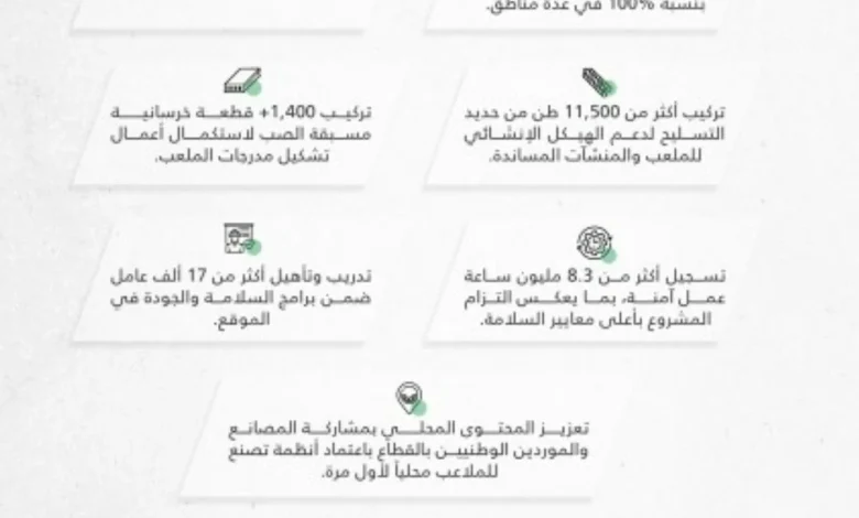 تتواصل الأعمال الإنشائية في ملعب مدينة الملك فهد الرياضية بالرياض، إذ شرع العاملون بتركيب الهيكل المعدني لسقف (الخيمة) بحلتها الجديدة، وكذلك تم تركيب فتحات تكييف الملعب والمدرجات وعمل التمديدات الرئيسية للتكييف، ومن ثم اكتمال أعمال الأنفاق ومداخل اللاعبين والبنية التحتية الحيوية، في عدة مناطق وإنجاز أكثر من 111 ألفا من الأعمال الخرسانية، وتم تركيب أكثر من 11,500 طن من حديد التسليح لدعم الهيكل الإنشائي للملعب والمنشآت المساندة، وتركيب 1,400 قطعة خرسانية مسبقة الصب لاستكمال أعمال تشكيل مدرجات الملعب، وتم تأهيل أكثر من 17 ألف عامل ضمن برامج السلامة والجودة في الموقع، بما يعكس التزام المشروع بأعلى معايير السلامة، كما تم تعزيز المحتوى المحلي بمشاركة المصانع والموردين الوطنيين بالقطاع باعتماد أنظمة تصنع للملاعب محلياً لأول مرة.