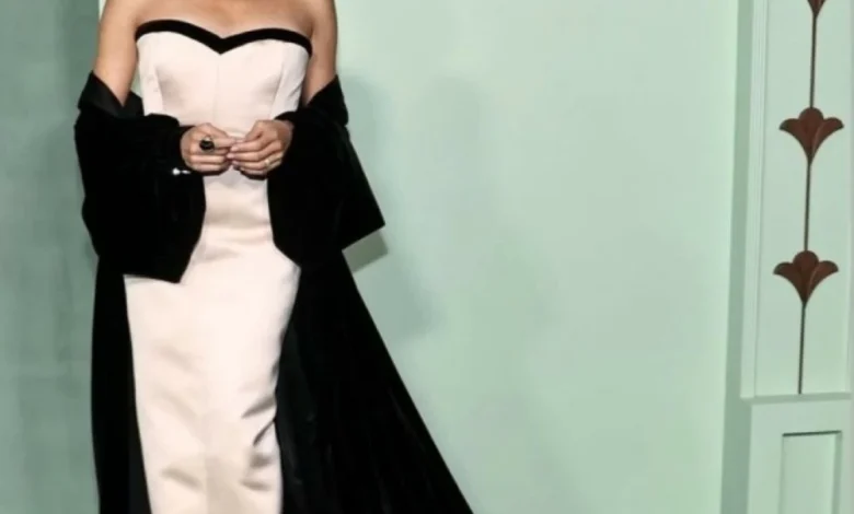 As for accessories, she opted for simplicity by choosing delicate earrings that enhanced the classic character of the look without distracting from the dress’s details. She completed her appearance with a sleek back hairstyle that clearly showcased her facial features, giving the look a chic modern touch, reaffirming her reliance on a simple style that focuses on refined details and clean lines.
