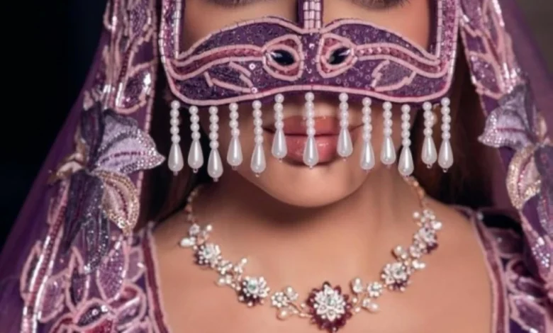 العنصر الأبرز كان غطاء الوجه المستوحى من البرقع التقليدي، والمطرّز بعناية مع خيوط متدلّية أضافت بعدًا احتفاليًا ودراميًا، في إشارة ذكية إلى الجذور الثقافية الخليجية بأسلوب مُحدّث. الطرحة الشفافة المنسدلة أكملت المشهد، ومنحت الحركة خفة تُخفف من كثافة التطريز، بينما حافظت على وقار الإطلالة.