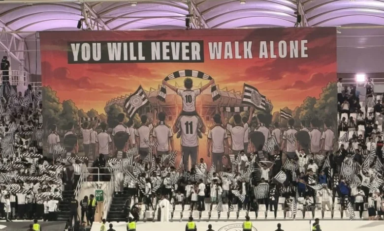 The Al-Shabab fans raised a large banner that read “You’ll Never Walk Alone” during the match against Al-Hilal at the SHG Arena in Riyadh, as part of the 24th round of the Saudi Professional League (Roshen League), which ended with a score of (5-3) in favor of Al-Hilal. This striking scene captured attention and ignited the atmosphere in the stands with the famous slogan, inspired by the song You’ll Never Walk Alone, historically associated with Liverpool FC. It carried a clear message of loyalty from the Al-Shabab supporters to their players, affirming that support will always be present in all circumstances, whether in moments of brilliance or during challenges.