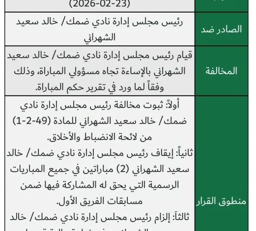 فتحت لجنة الانضباط والأخلاق في الاتحاد السعودي لكرة القدم بابًا واسعًا من الجدل الجماهيري بعد قرارها إيقاف رئيس مجلس إدارة نادي ضمك خالد الشهراني مباراتين رسميتين، عقب ثبوت إساءته لمسؤولي مباراة ضمك والأهلي وفق ما ورد في تقرير حكم اللقاء، وهو قرارٌ أعاد النقاش مجددًا حول معيار العدالة والانضباط في العقوبات، ومدى اتساقها مع حالات مشابهة شهدها الموسم الرياضي الحالي.
