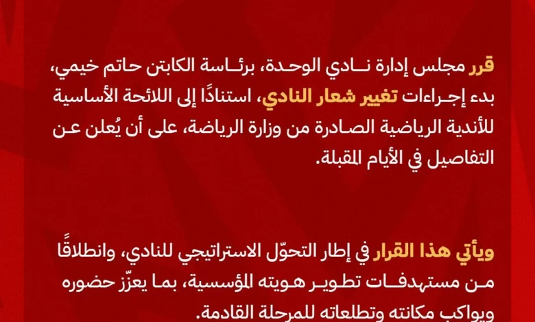اتخذ مجلس إدارة نادي الوحدة برئاسة حاتم خيمي قرارا تاريخيا بتغيير الشعار الخاص بالنادي، حيث أعلن بدء إجراءات تغيير شعار النادي، مؤكداً أن تلك الخطوة تأتي في إطار التحول الإستراتيجي للنادي وانطلاقا من مستهدفات تطوير هويته المؤسسية بما يعزز حضوره ويواكب مكانته وتطلعاته للمرحلة القادمة.