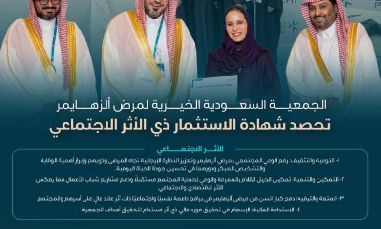وجاءت الشهادة اعترافًا مباشرًا بالأثر الاجتماعي الذي يحقق رفع الوعي المجتمعي بمرض ألزهايمر، وتعزيز النظرة الإيجابية تجاه المرضى وذويهم من خلال حملات تثقيفية ومشاريع تطوعية نشطت في مختلف مناطق المملكة، وإبراز أهمية الوقاية والتشخيص المبكر، ودورهما في تحسين جودة الحياة اليومية، وهو ما أسهم في دعم الأسر، وتمكينها من التعامل السليم مع المرض في مراحله المختلفة.